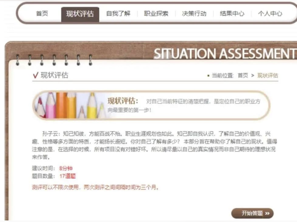系统引进国内权威吉讯测评系统,包括有现状评估、自我了解、职业探索、决策行动、结果中心五大板块。