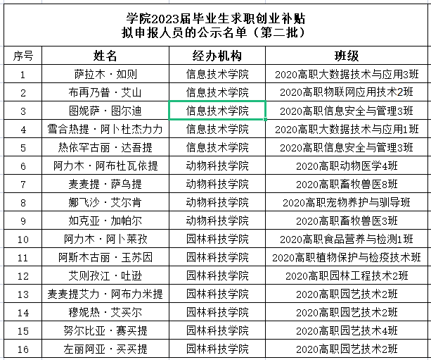 根据自治区人力资源和社会保障厅、自治区财政厅《关于进一步做好毕业生求职创业补贴工作的通知》要求,帮助2023届困难毕业生尽快实现就业创业,经学生自愿申请、分院初审、学院复核等程序,第二批共有16名毕业生材料审核合格,拟报送昌吉市人力资源和社会保障局、财政局进行审批,现予以公示。